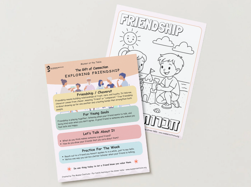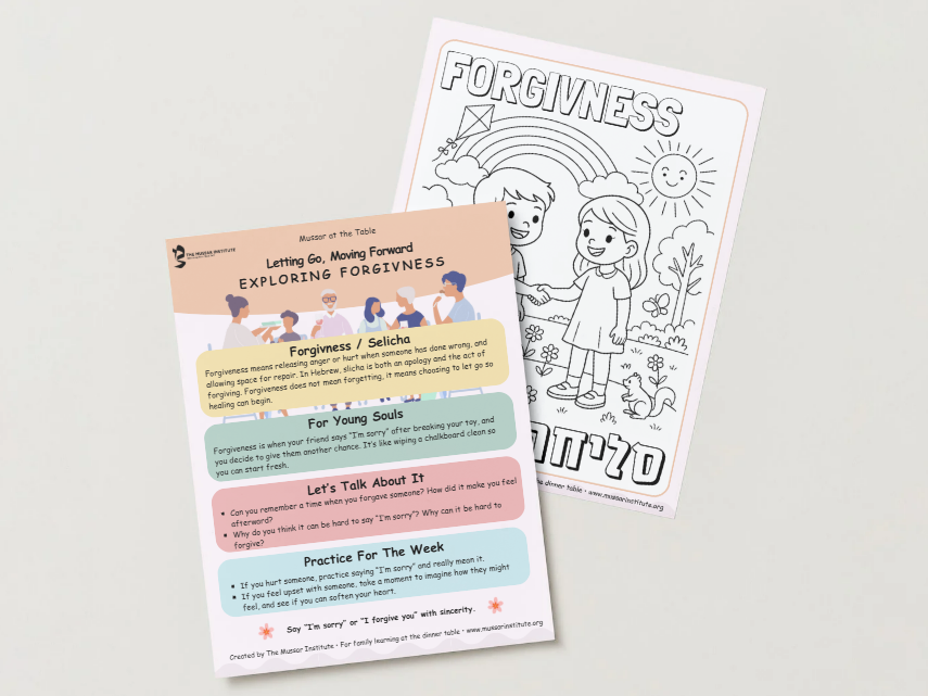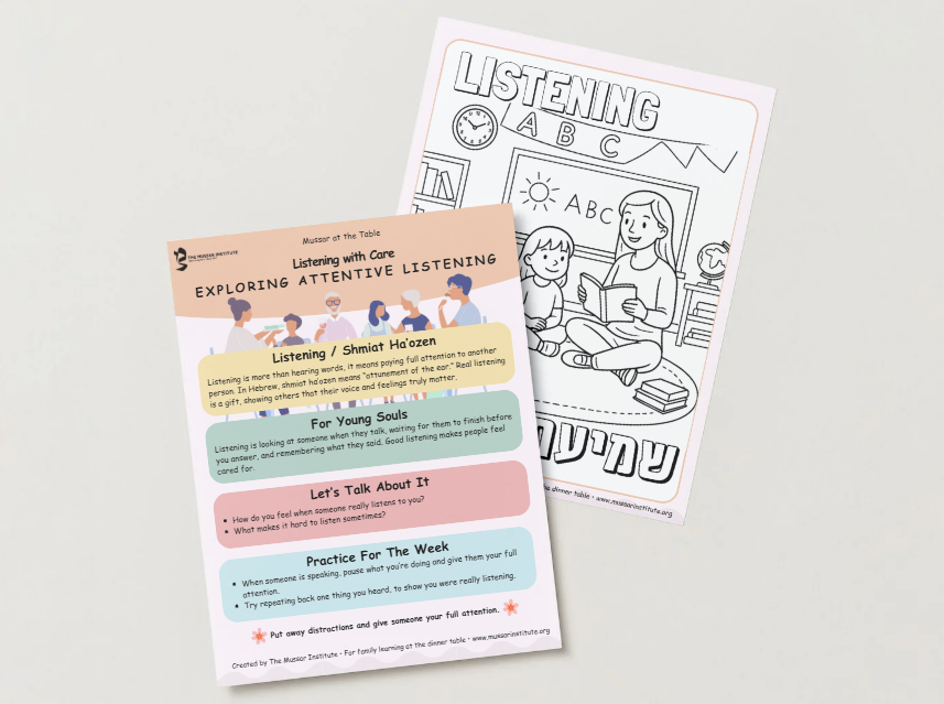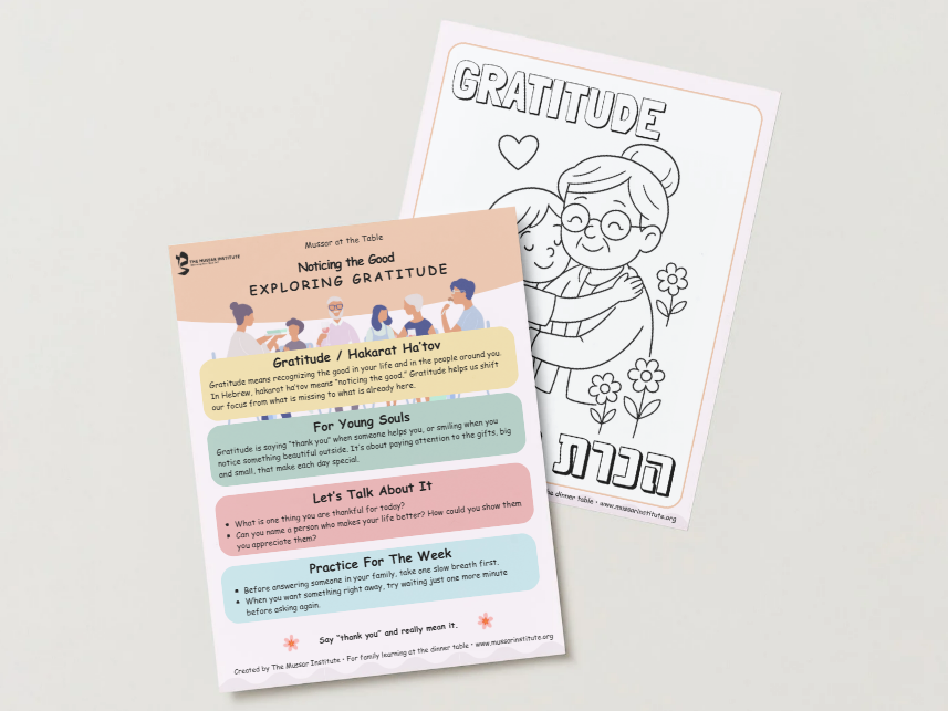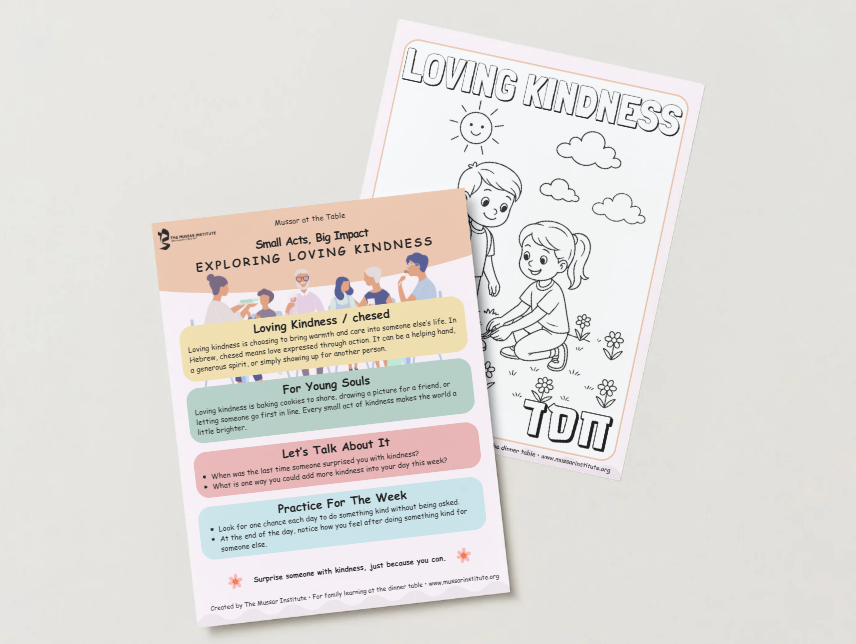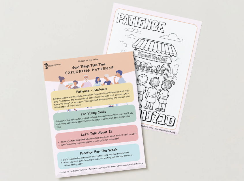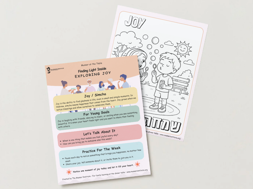 Mussar at the Table is a free resource that brings timeless Jewish wisdom into the heart of family life. Each offering gives you a simple way to pause together, whether over dinner, Shabbat, or a quiet moment at home, and reflect on a middah (soul trait) like patience, gratitude, or compassion.
